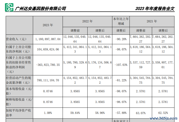 如今的达安基因,风光不再。2023年年报显示,达安基因实现营收11.81亿元,较2022年同期减少90.20%;实现归母净利润1.05亿元,同比减少98.07%。