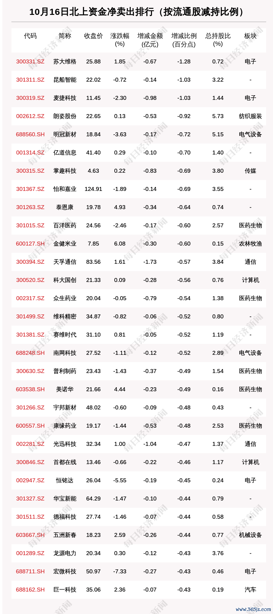 10月16日,北上资金净卖出的个股共有1,523只,北上资金减仓比例超1%的有1,314只。其中,苏大维格(300331.SZ,收盘价:25.88元)减仓比例最为明显,最新持股比例0.72%,环比减少1.28个百分点。其他北上资金减仓比例较多的个股还包括昆船智能(301311.SZ,收盘价:22.02元)、麦捷科技(300319.SZ,收盘价:11.45元)、朗姿股份(002612.SZ,收盘价:22.65元)。