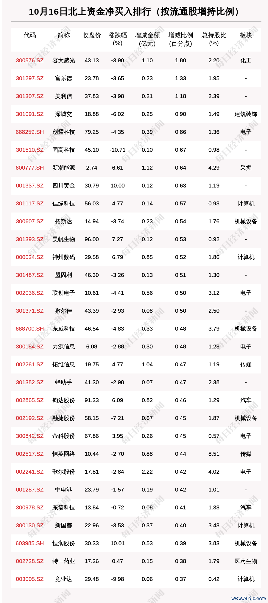 每经AI快讯,10月16日,北上资金净买入的个股共有973只,北上资金加仓比例超1%的有794只。其中,容大感光(300576.SZ,收盘价:43.13元)加仓比例最为明显,最新持股比例2.20%,环比增加1.80个百分点。其他北上资金加仓比例较多的个股还包括富乐德(301297.SZ,收盘价:23.78元)、美利信(301307.SZ,收盘价:37.83元)、深城交(301091.SZ,收盘价:18.88元)。