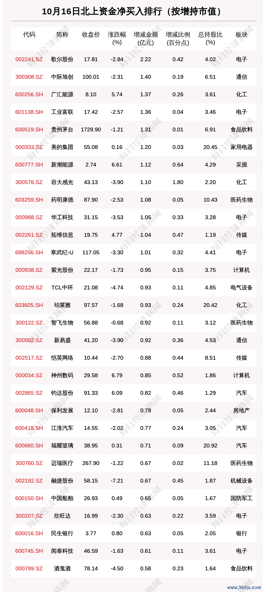 10月16日,按照北向资金增持市值排序,歌尔股份(002241.SZ,收盘价:17.81元)增持市值最大,增持市值2.219亿元,环比增加11.40%。其他北上资金增持市值较多的个股还包括中际旭创(300308.SZ,收盘价:100.01元)、广汇能源(600256.SH,收盘价:8.10元)、工业富联(601138.SH,收盘价:17.42元)。