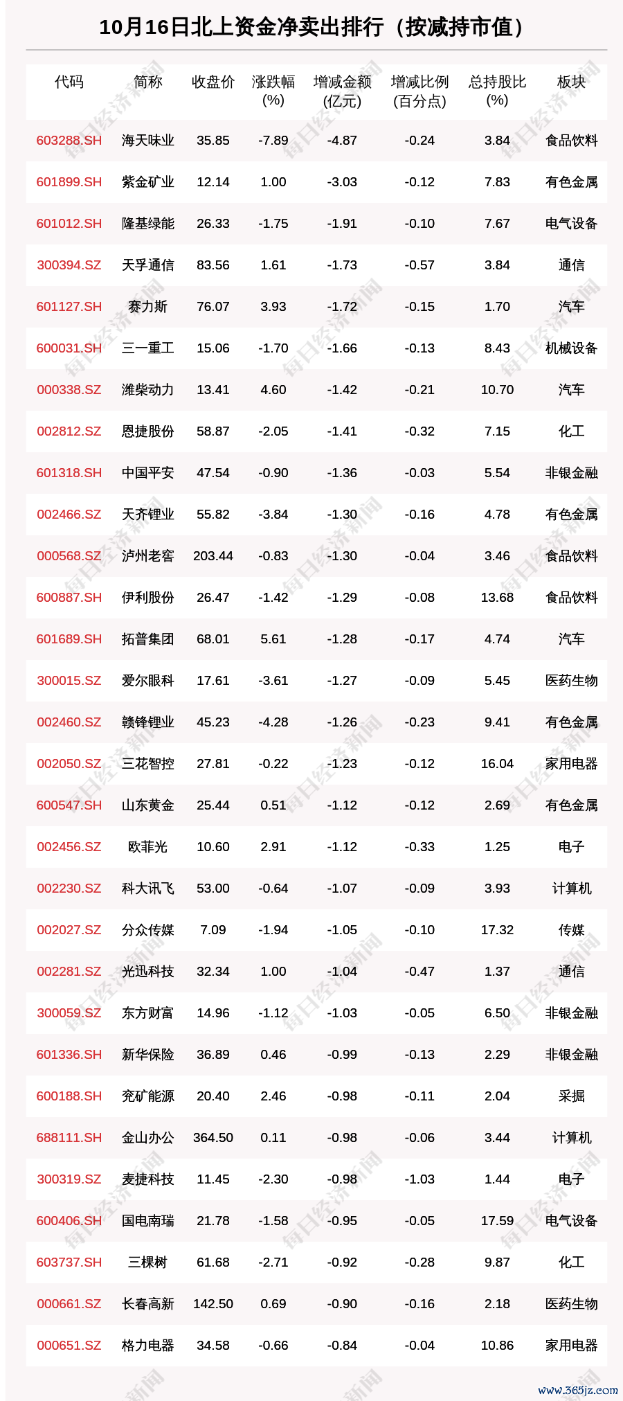 10月16日,按照北向资金减持市值排序,海天味业(603288.SH,收盘价:35.85元)减持市值最大,减持市值4.865亿元,环比减少5.50%。其他北上资金减持市值较多的个股还包括紫金矿业(601899.SH,收盘价:12.14元)、隆基绿能(601012.SH,收盘价:26.33元)、天孚通信(300394.SZ,收盘价:83.56元)。