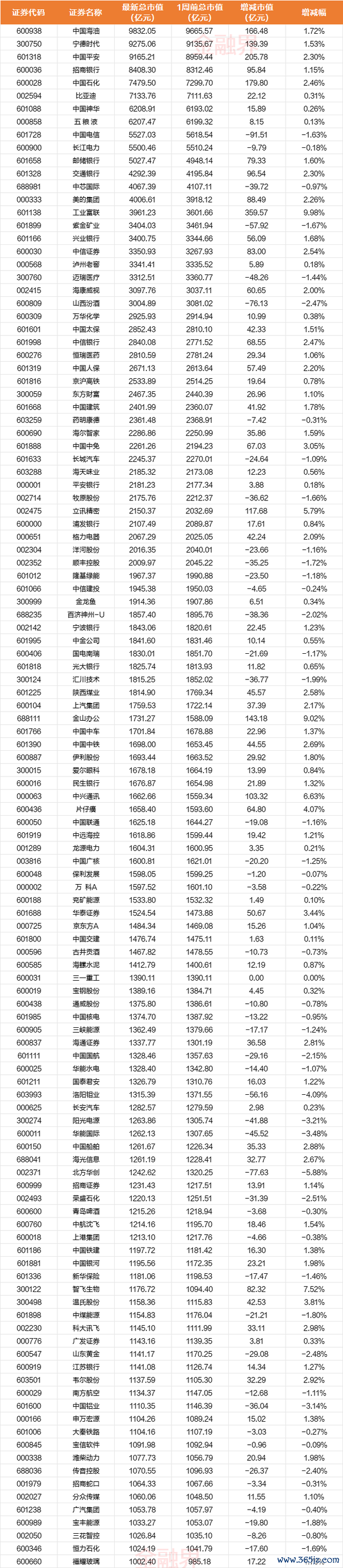 与前一周五收盘时相比,从市值增减金额来看,近两周的千亿市值公司中,工业富联一周增长359.57亿元领跑,中国平安市值增长205.78亿元,中国石化、、金山办公、宁德时代、立讯精密、中兴通讯均增长超100亿元,交通银行、招商银行市值增超95亿元。