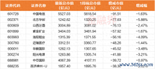 中国电信本周蒸发逾91.51亿元,、山西汾酒市值下跌超70亿元,紫金矿业、洛阳钼业市值均跌去逾50亿元,迈瑞医疗、华能国际、阳光电源市值均蒸发超40亿元,中芯国际、百济神州总市值减少近40亿元。